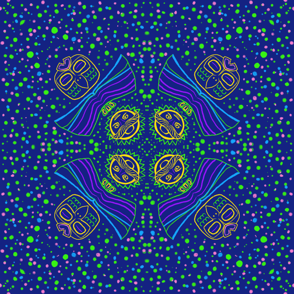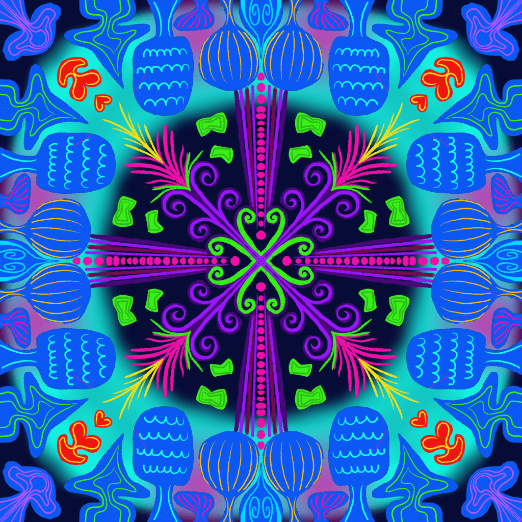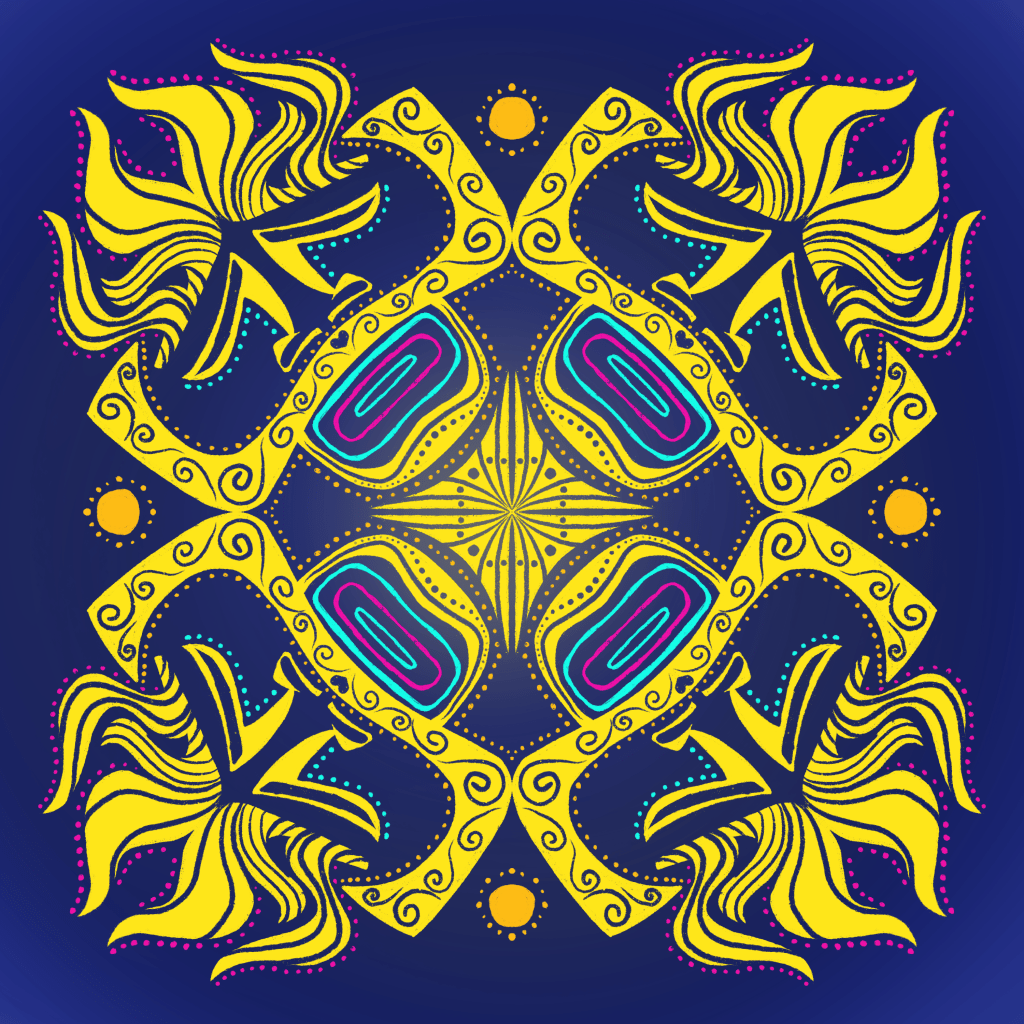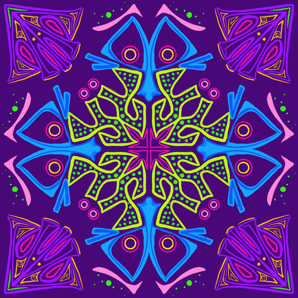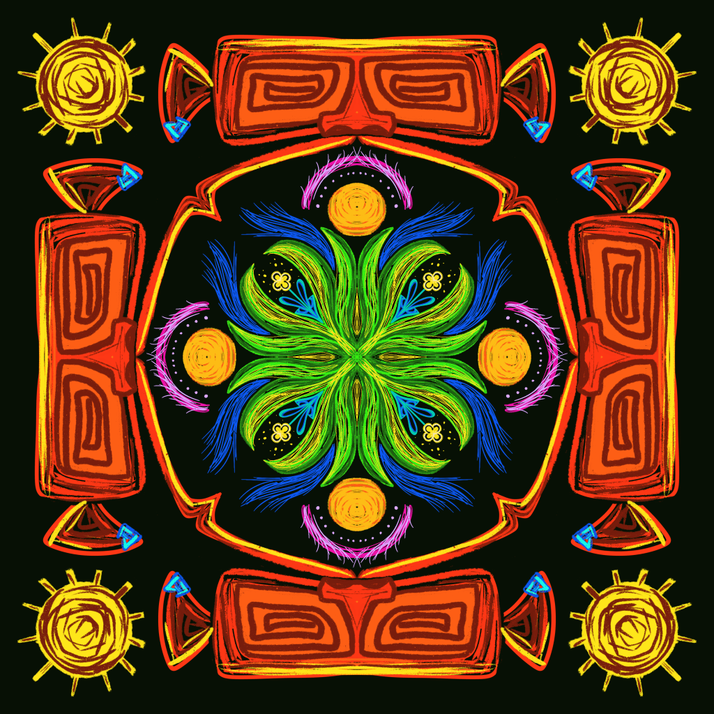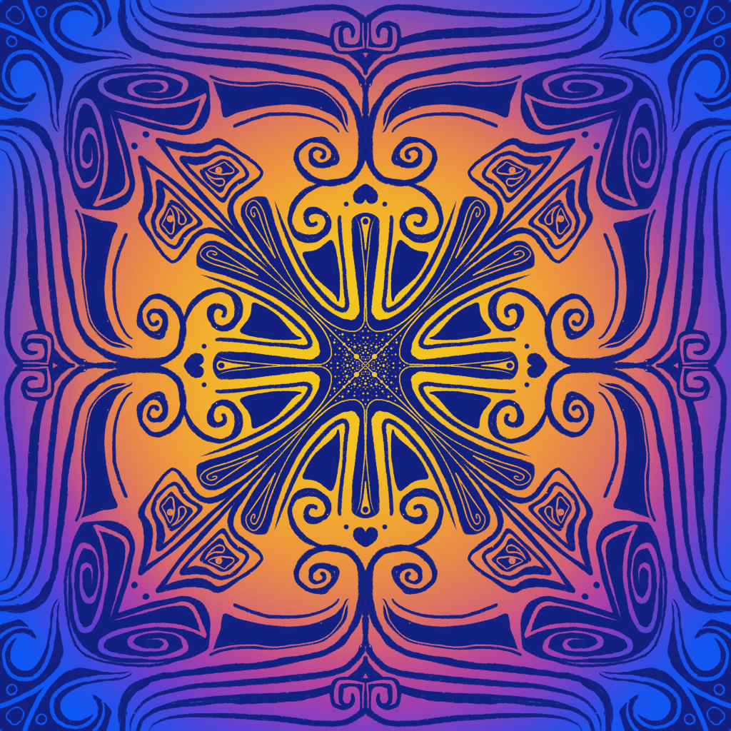 Hearing about the 100-day project, I decided to formalize my habit of drawing digital mandalas before bed, selecting a palette inspired by the vibrant textiles of Puerto Vallarta. Using Procreate, I exclusively employed a dry ink brush for the foreground and an airbrush and Hartz brush for the backgrounds.