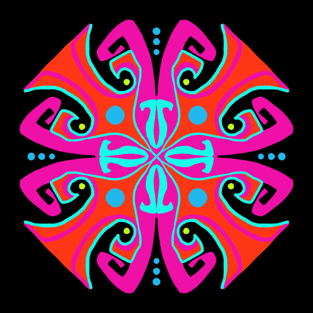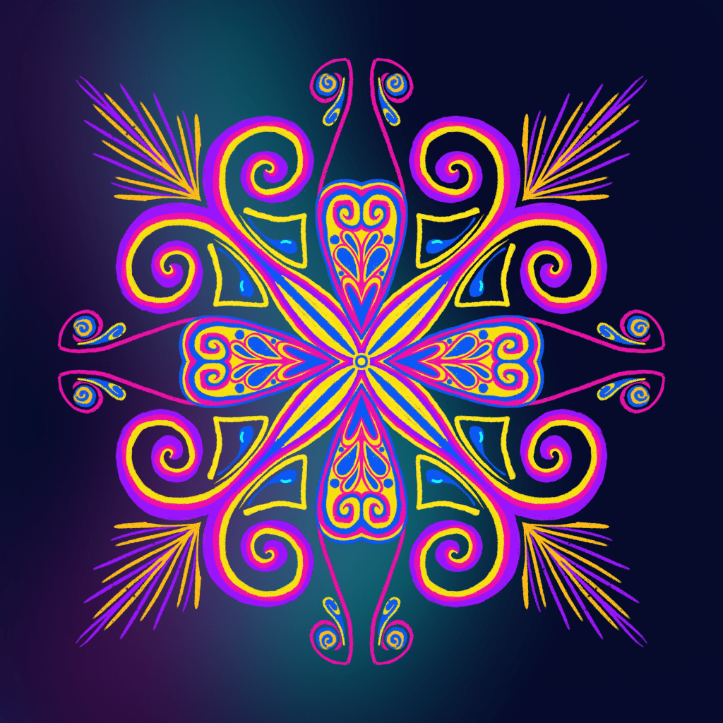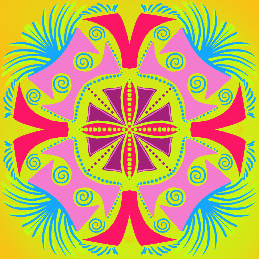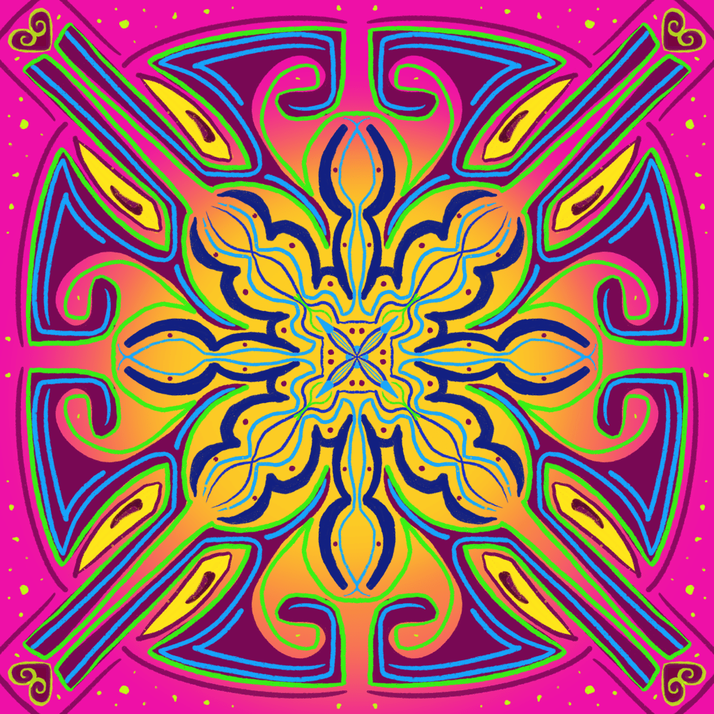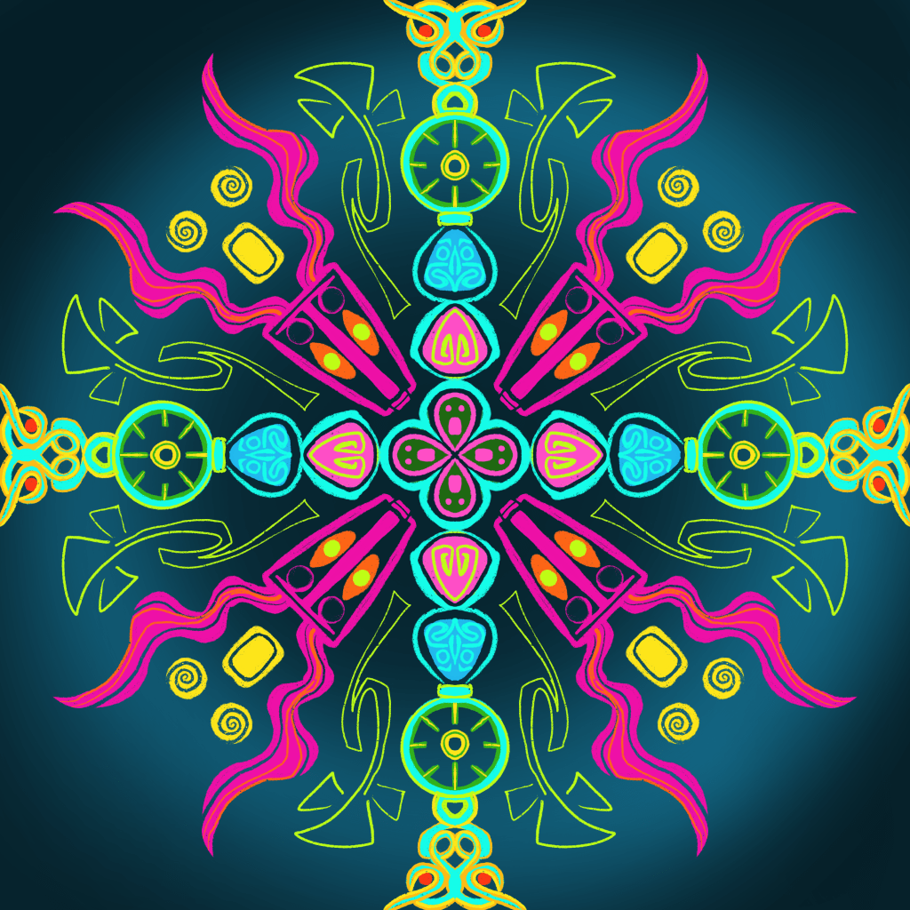 Hearing about the 100-day project, I decided to formalize my habit of drawing digital mandalas before bed, selecting a palette inspired by the vibrant textiles of Puerto Vallarta. Using Procreate, I exclusively employed a dry ink brush for the foreground and an airbrush and Hartz brush for the backgrounds.