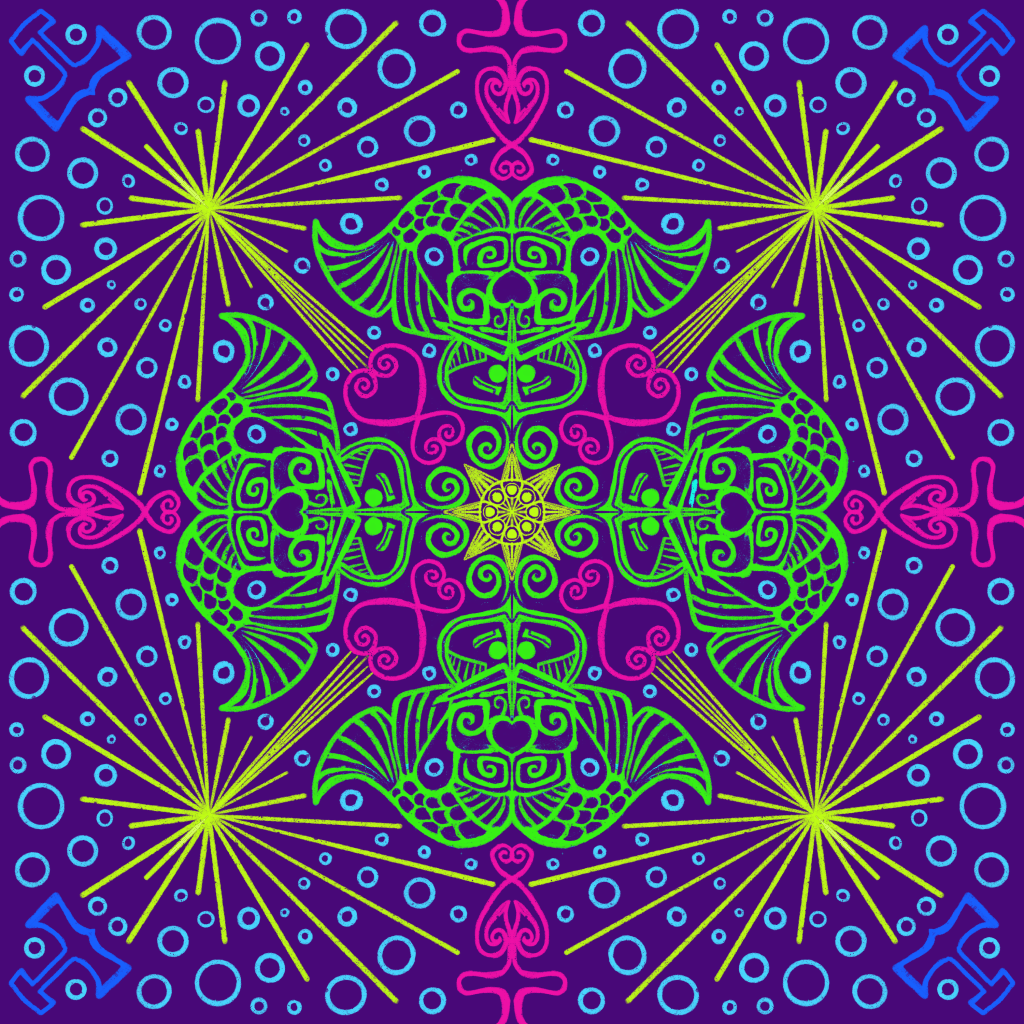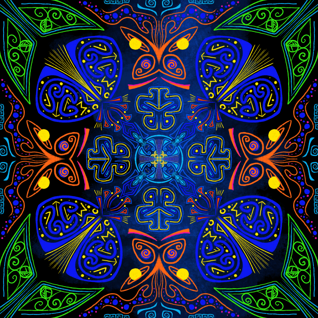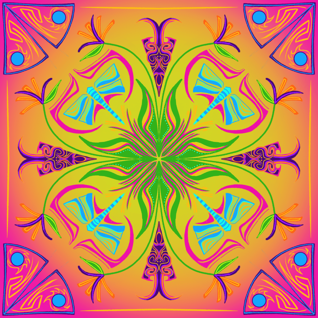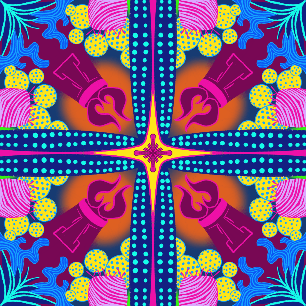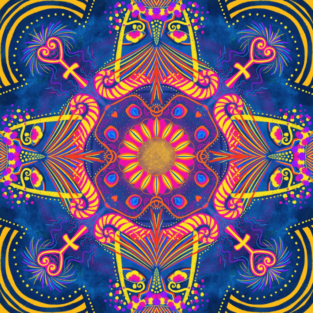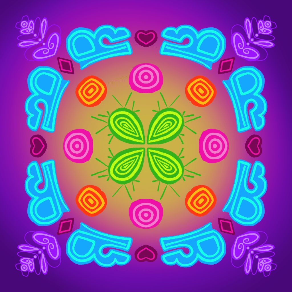 Hearing about the 100-day project, I decided to formalize my habit of drawing digital mandalas before bed, selecting a palette inspired by the vibrant textiles of Puerto Vallarta. Using Procreate, I exclusively employed a dry ink brush for the foreground and an airbrush and Hartz brush for the backgrounds.