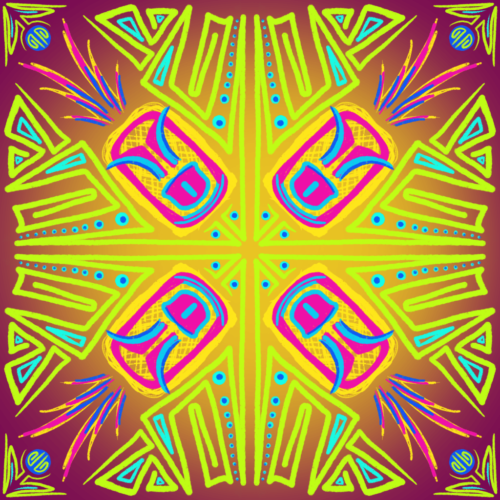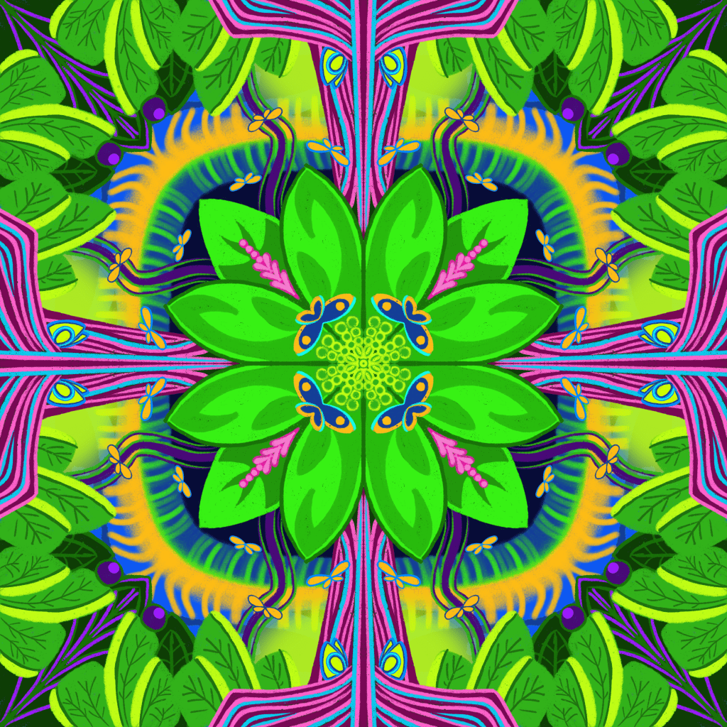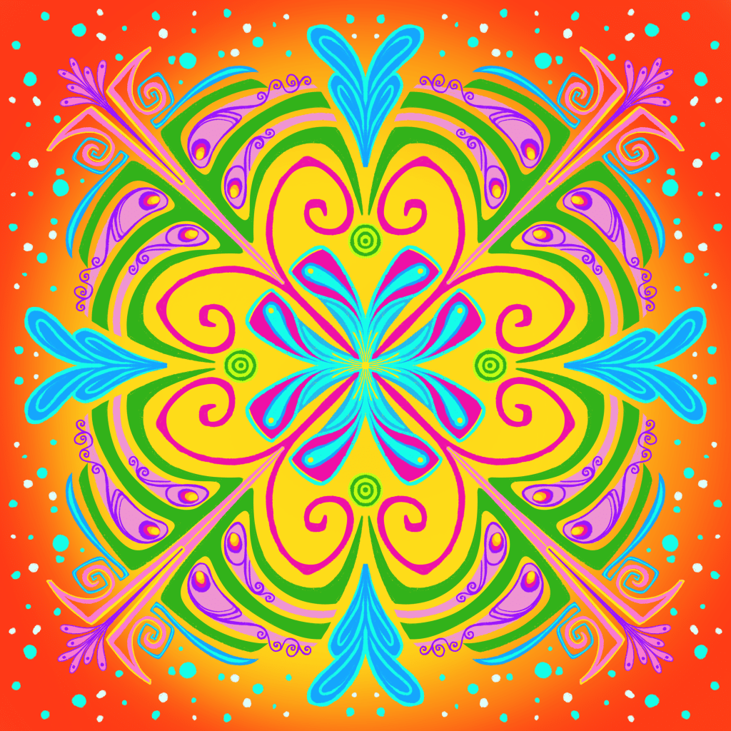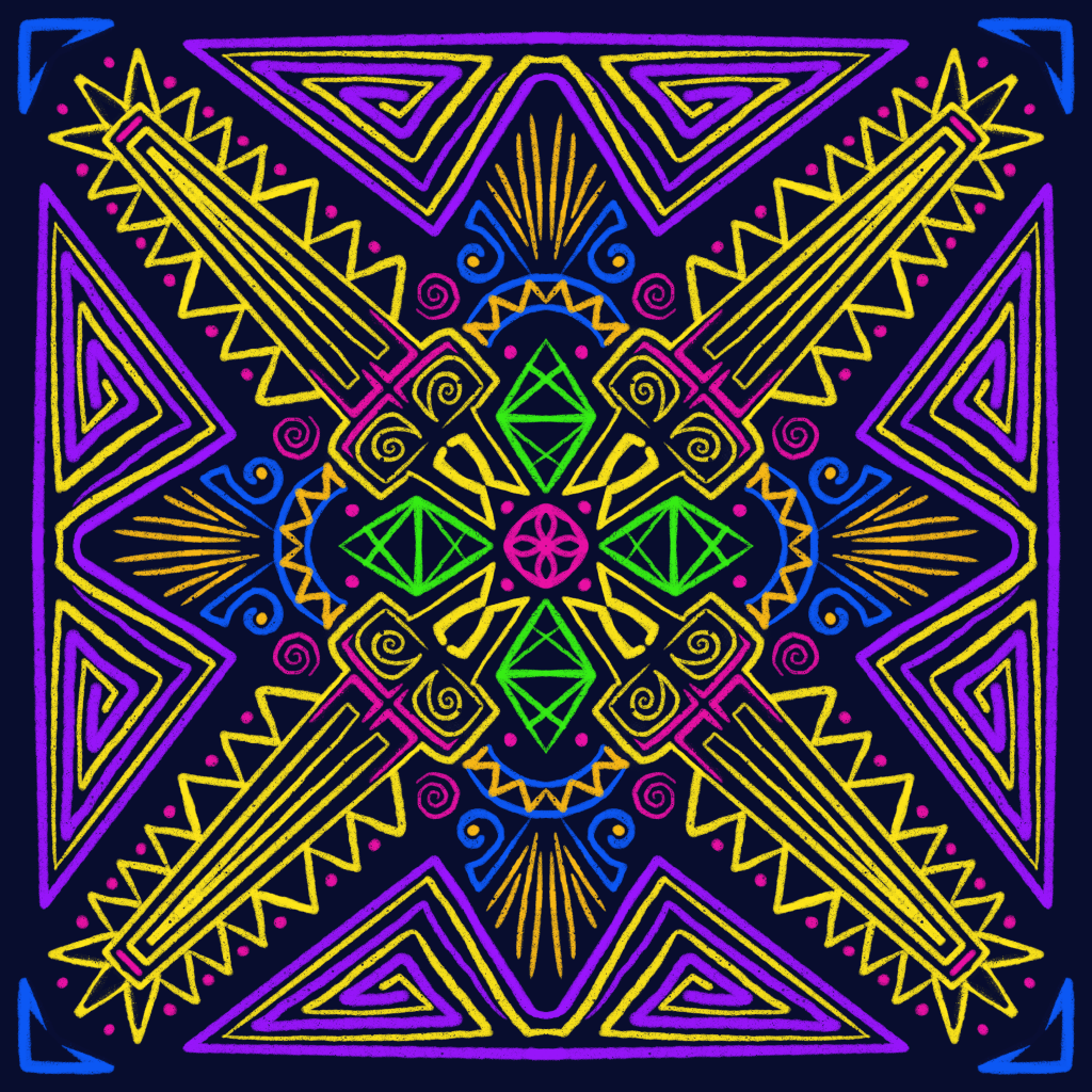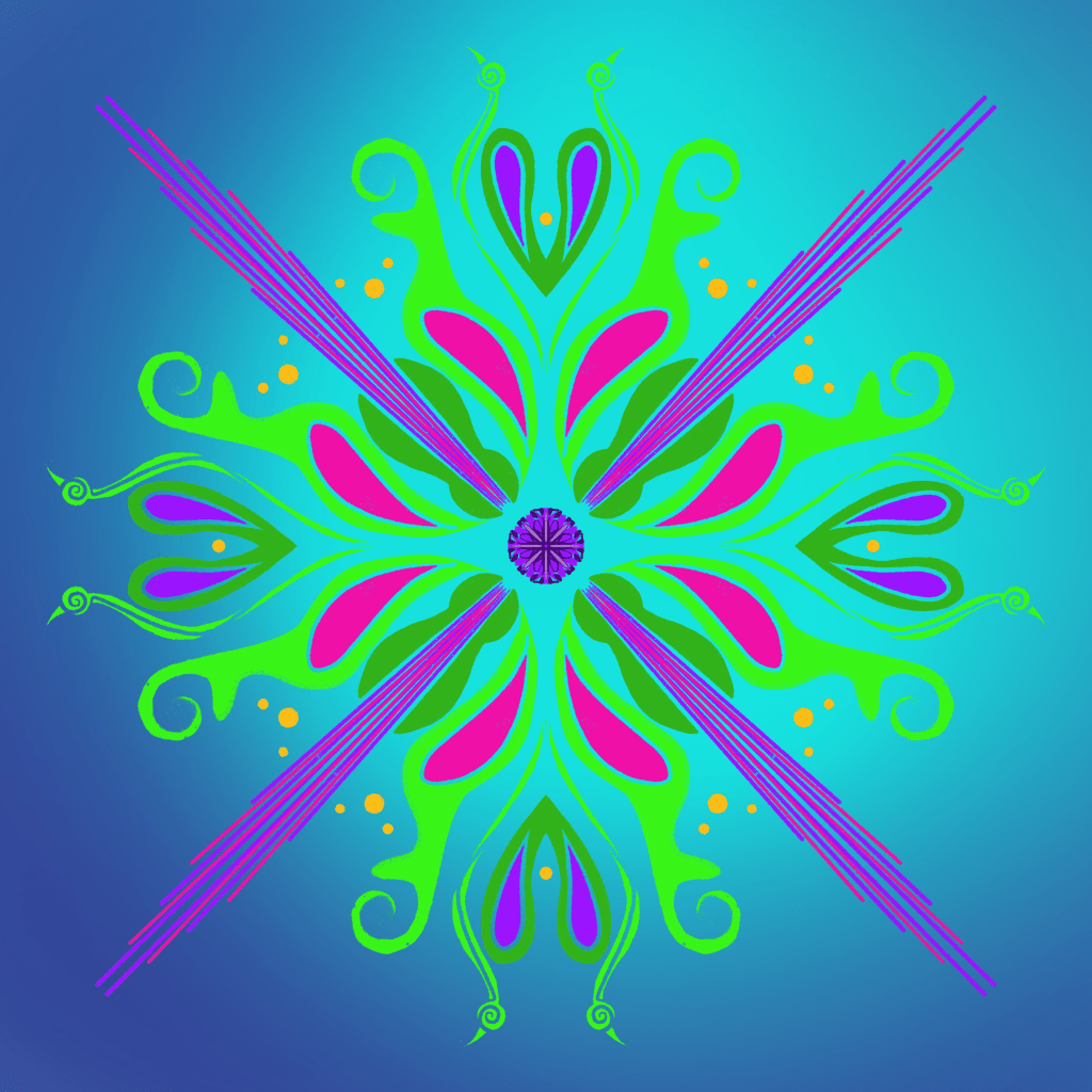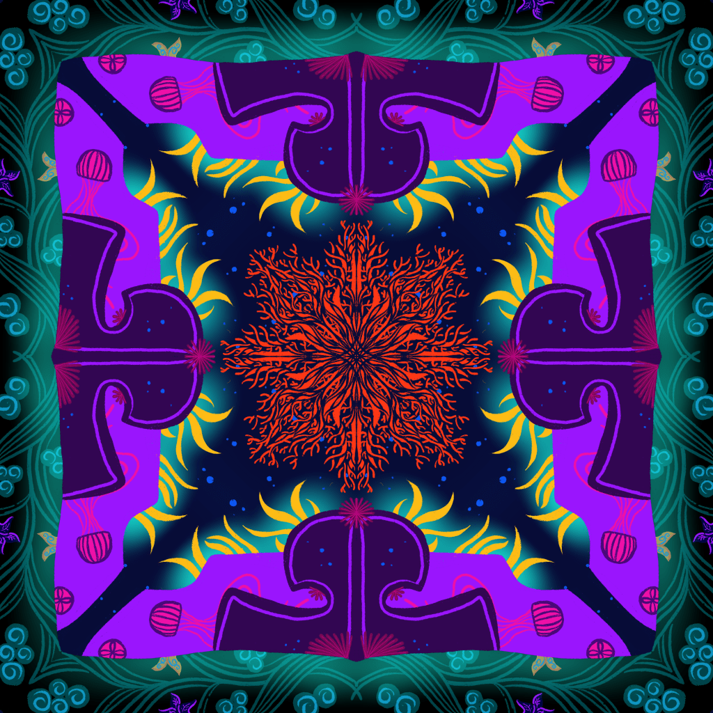 Hearing about the 100-day project, I decided to formalize my habit of drawing digital mandalas before bed, selecting a palette inspired by the vibrant textiles of Puerto Vallarta. Using Procreate, I exclusively employed a dry ink brush for the foreground and an airbrush and Hartz brush for the backgrounds.